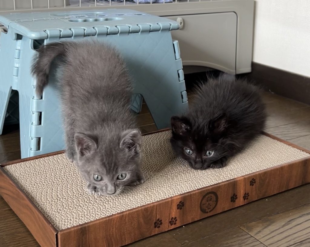 保護猫ボランティアさんのおすすめで、1匹だと留守番の時など寂しい思いをするという事で、メスとオスの2匹の兄妹で引き取りました。